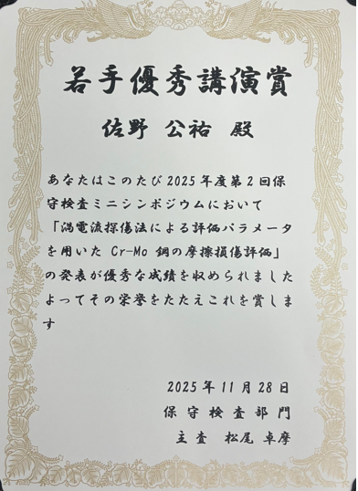 D3 LE QUANG TRUNGさん 神奈川県非破壊試験技術交流会奨励賞を受賞!!